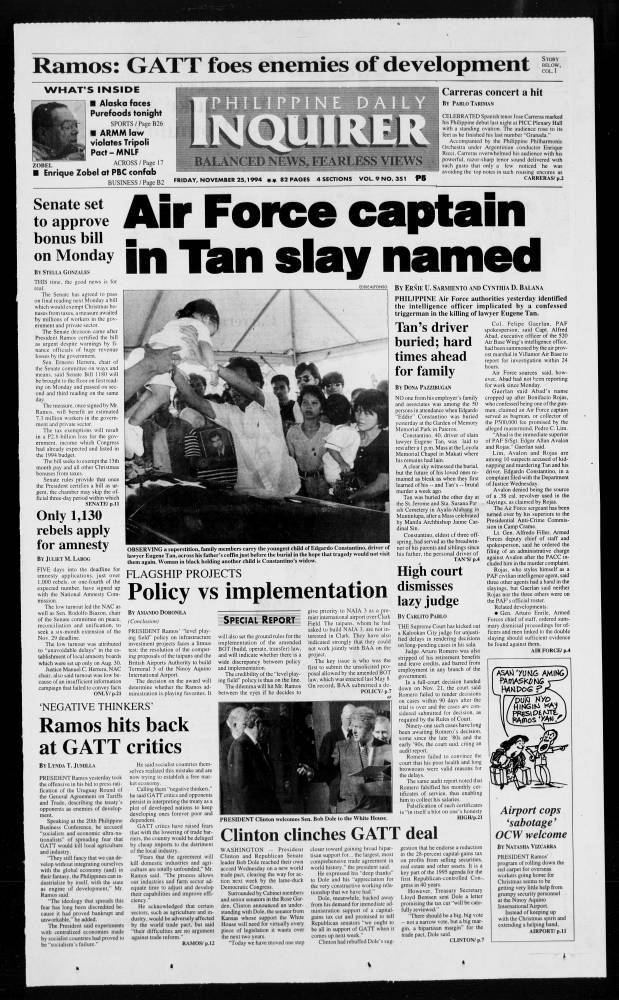 November 25, 1994: Air Force captain in Tan slay named by Philippine Daily Inquirer November 25, 2023 November 25, 1994. 0 Comments