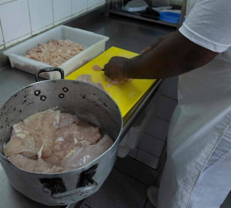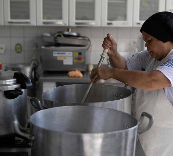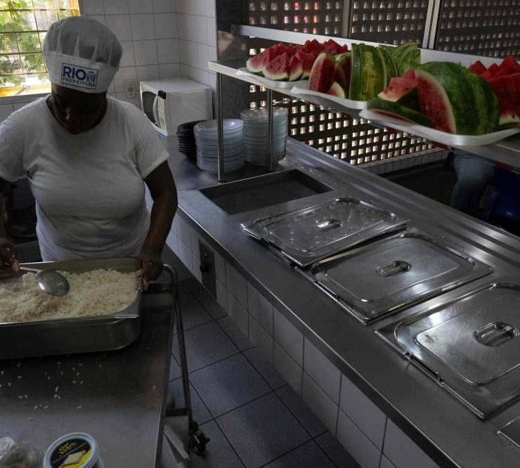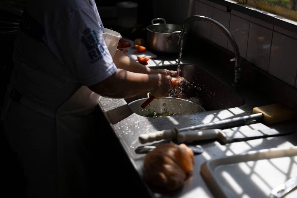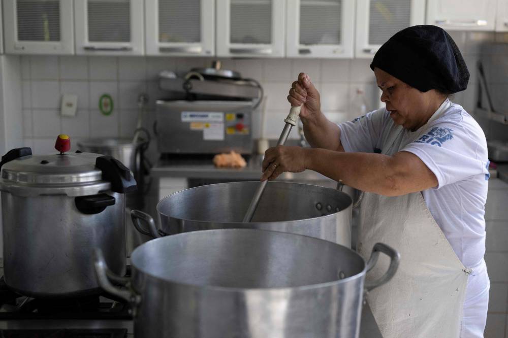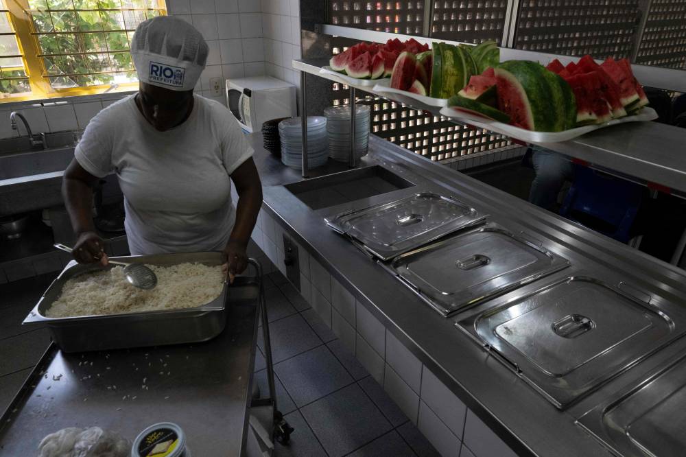 A cook works at the municipal Burle Marx school's kitchen in Rio de Janeiro, Brazil,on April 4, 2024. Nearly one-third of children in Brazil are obese, an epidemic city health officials and community leaders are seeking to address in innovative ways, enlisting school cafeterias and taking their message of healthful eating to the street. (Photo by Pablo PORCIUNCULA / AFP)