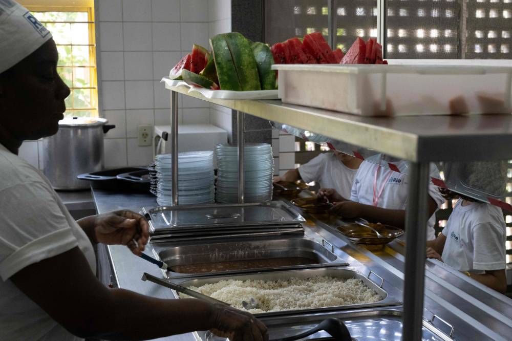 A cook serves food to the students at the municipal Burle Marx school in Rio de Janeiro, Brazil, on April 4, 2024. Nearly one-third of children in Brazil are obese, an epidemic city health officials and community leaders are seeking to address in innovative ways, enlisting school cafeterias and taking their message of healthful eating to the street. (Photo by Pablo PORCIUNCULA / AFP)