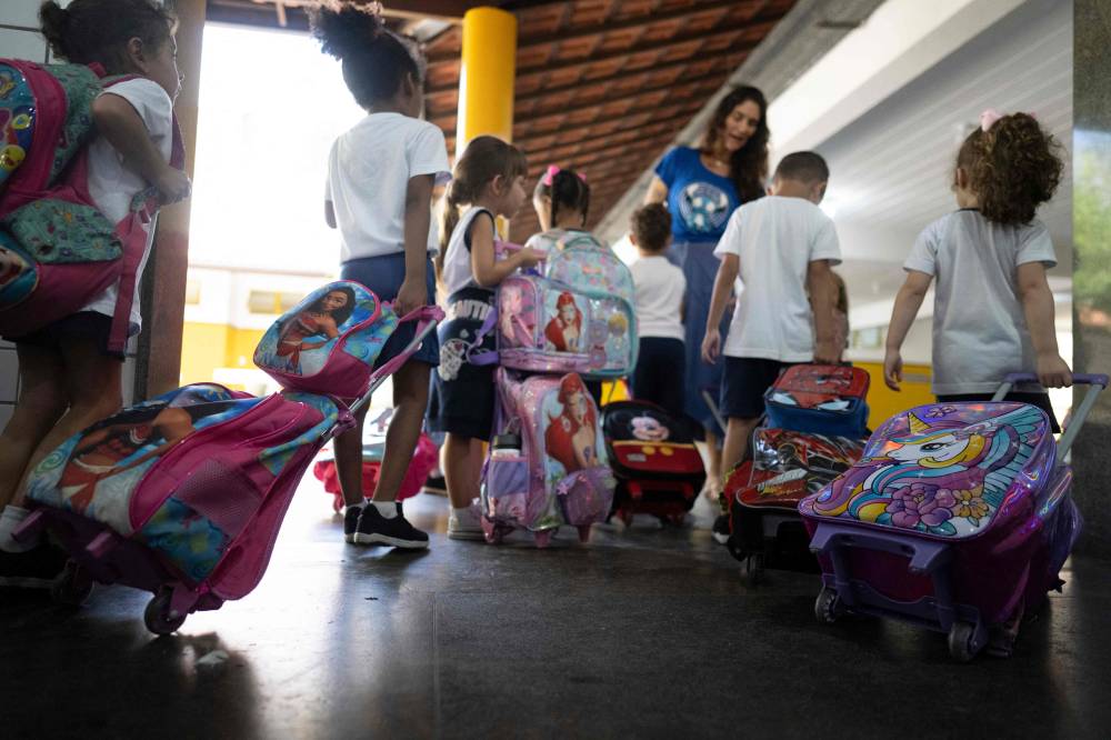 Students leave the school canteen after eating lunch at Municipal Burle Marx School in Rio de Janeiro, Brazil, on April 4, 2024. . Nearly one-third of children in Brazil are obese, an epidemic city health officials and community leaders are seeking to address in innovative ways, enlisting school cafeterias and taking their message of healthful eating to the street. (Photo by Pablo PORCIUNCULA / AFP)