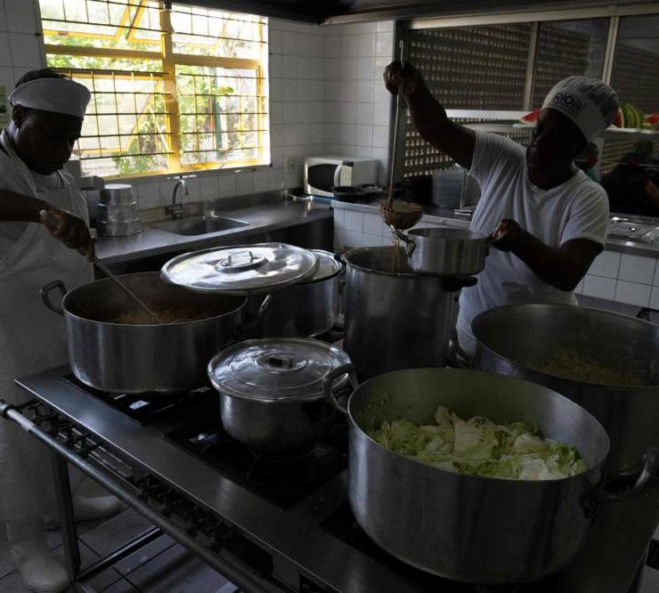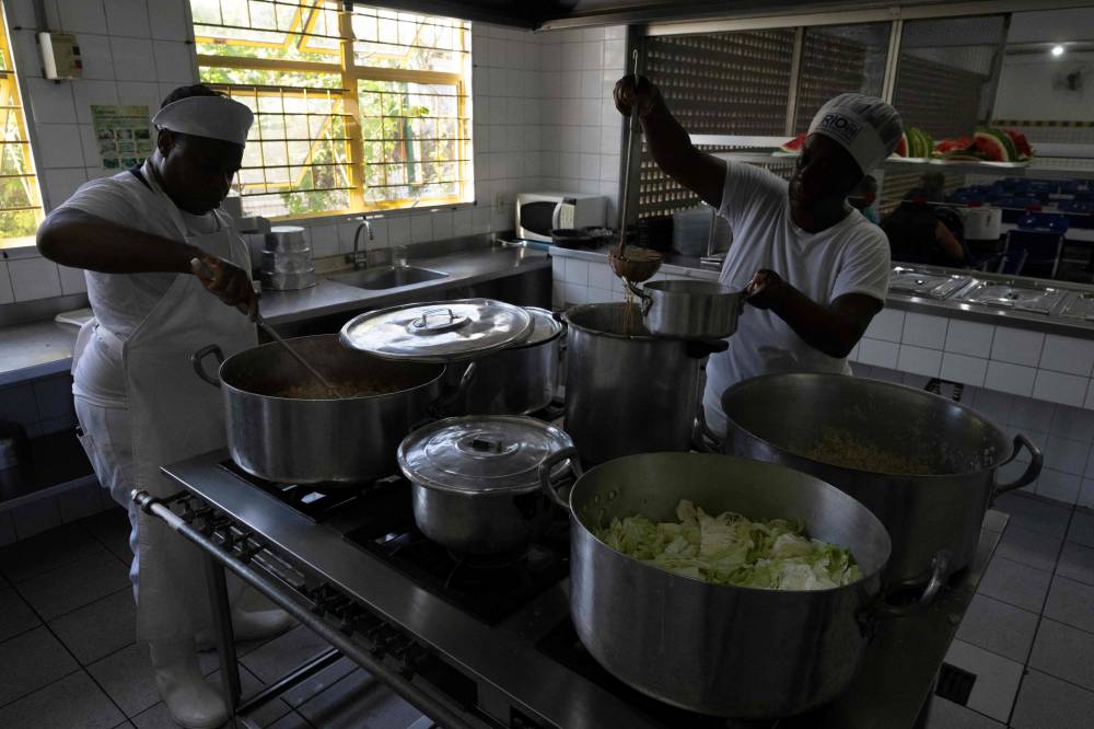 Cooks work at the municipal Burle Marx school's kitchen in Rio de Janeiro, Brazil, on April 4, 2024. Nearly one-third of children in Brazil are obese, an epidemic city health officials and community leaders are seeking to address in innovative ways, enlisting school cafeterias and taking their message of healthful eating to the street. (Photo by Pablo PORCIUNCULA / AFP)