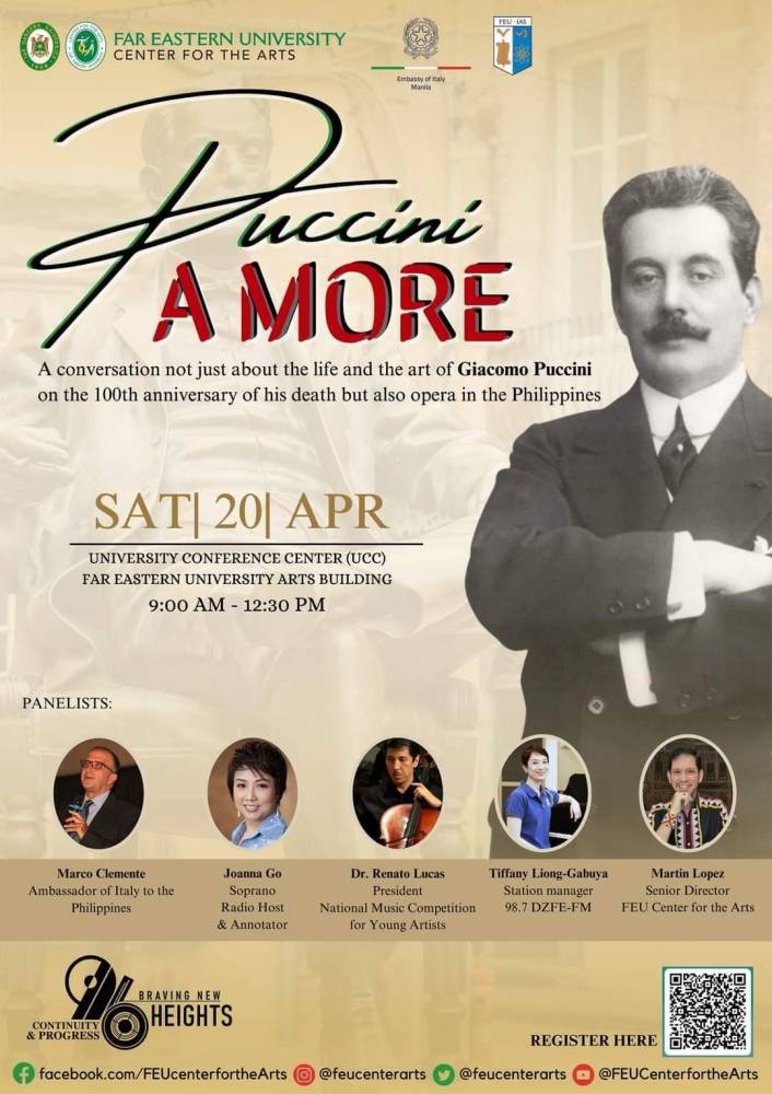 In commemoration of the 100th death anniversary of Giacomo Puccini, the Embassy of Italy in the Philippines and the Far Eastern University (FEU) Center for the Arts, with the FEU Institute of Arts and Sciences, present “Puccini Pa More.”