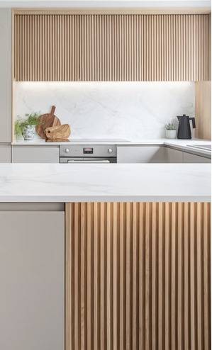 Bring in the warmth of stone with these lightweight, fiberglass-backed stone veneers or composite stone material for elements that can’t accept the weight or thickness of natural stone. Use them for cabinetry, door panels, or wall cladding.