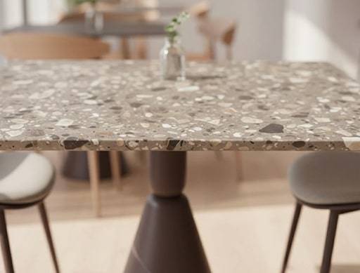Replace your old, battered tabletop with a new, solid terrazzo top. Nostalgic color patterns are available in various styles—from playful to elegant—with aggregates that create various visual textures and which can turn your flat surface into a layered visual composition.