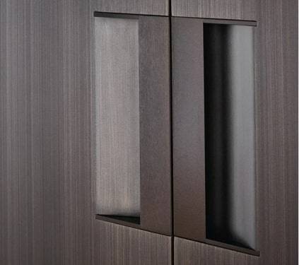 Building up new shelving or millwork? Modern materials support the construction of thin-profile cabinetry, where door panels go down to a mere 12-mm thickness, and where surfaces are devoid of detail. With less material, there is less consumption, and the bonus of lighter looking furniture and millwork.