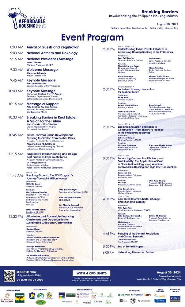 At the summit closing, OSHDP vice president Charlie Brown Tan will read the resolutions passed during the event, reflecting the collective commitment of all stakeholders to push forward with the initiatives discussed. His closing remarks is poised to reiterate the need for continued collaboration to overcome the barriers facing the housing sector.
