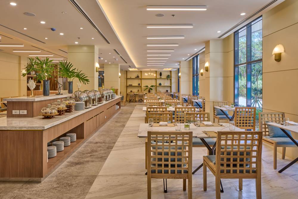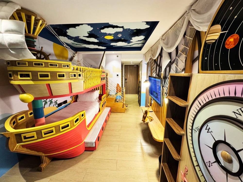 Still in its soft opening, the hotel currently offers a third of its planned 554 suites. These include Twin and Queen rooms and the more expansive Executive and Presidential suites designed for larger families, alongside accessible accommodations. It also introduces the island’s first themed children’s rooms—pirate ship, Peter Pan, and 20,000 Leagues Under the Sea—all opening to sweeping views of either the sea or the township promenade.