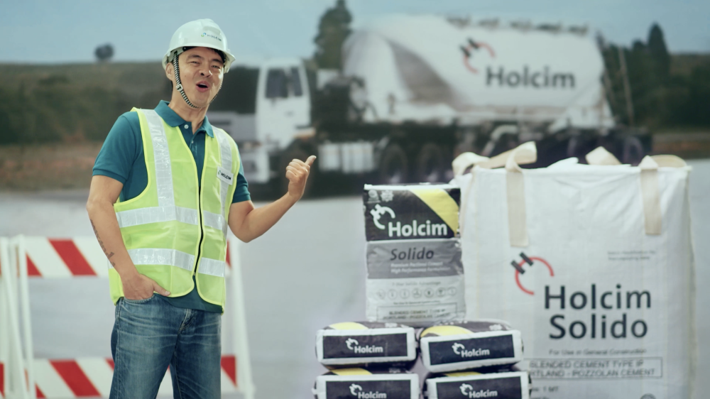 In the ad, Miranda, frontman of the rock band Parokya ni Edgar, plays a sales officer confidently guaranteeing potential customers—a homeowner, an architect, and a contractor—that Holcim has the right solution for constructing homes, buildings, and roads.