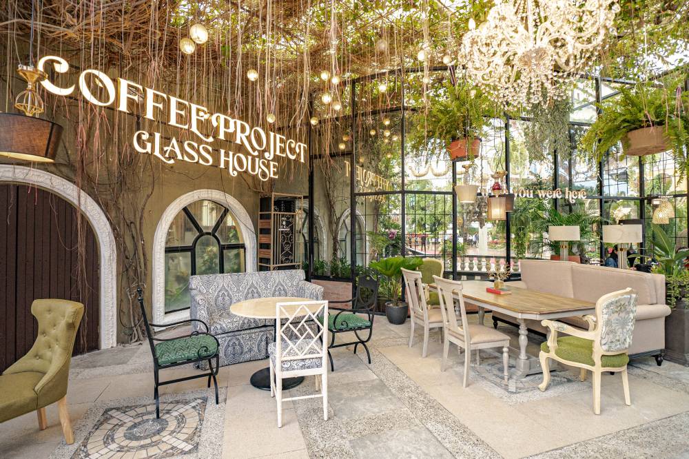 Step into a world of elegance with a bit of whimsy and charm at the Glass House by Coffee Project, with its lush greenery and delicate blooms creating that magical ambiance. Its glass walls let natural light in, creating a space that’s warm, and inviting.