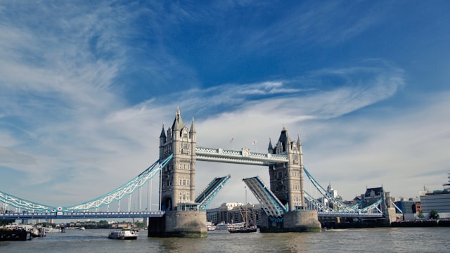 The Tower Bridge in London, which crosses the River Thames, is a defining landmark in the United Kingdom. The bridge, completed in 1894, is 244 meters long and has 65-meter-high towers. Designed by city architect Horace Jones in collaboration with John Wolfe Barry, it addressed concerns on how to build a bridge downstream from London Bridge without interfering with river traffic.