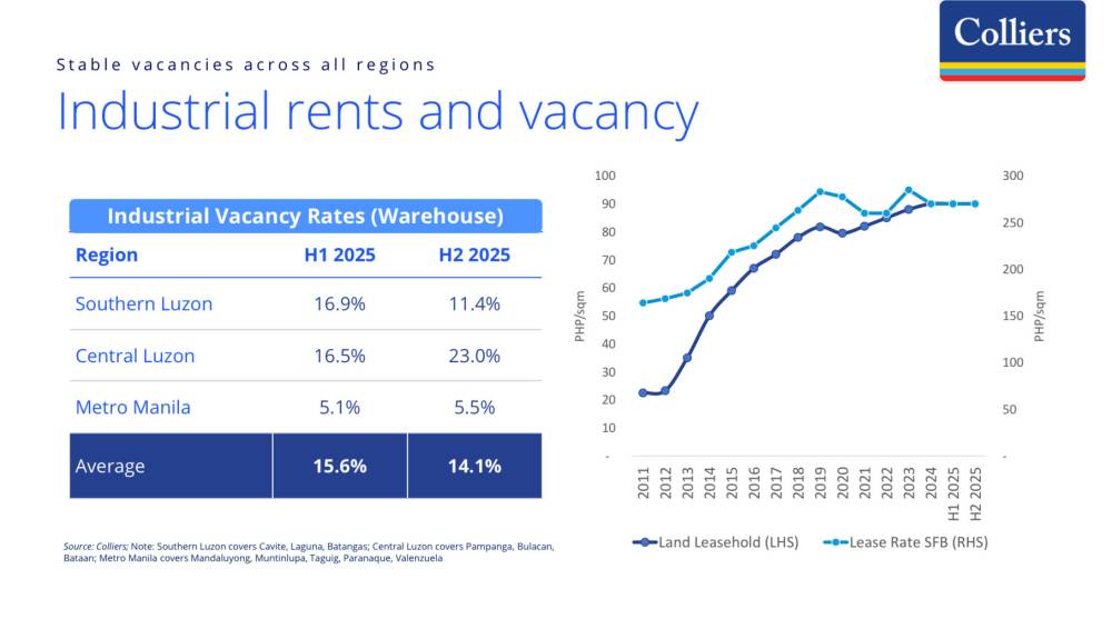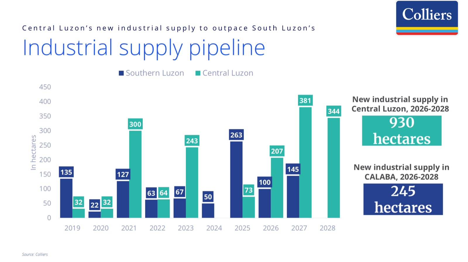 From 2026 to 2028, Colliers sees the delivery of 930 hectares of new industrial supply in Central Luzon, dwarfing the expected 240 ha in Southern Luzon during the same period.