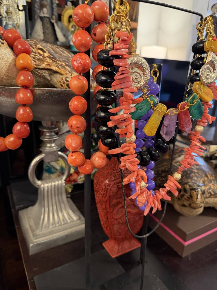 I can’t leave the house without a statement piece on my neck. Not only are they fun fashion pieces, they also double as funky decor items. Place them on top of coffee table books, trays, use them as bowl fillers, or display them on wrought iron stands. This particular necklace is from Rambutan Home.