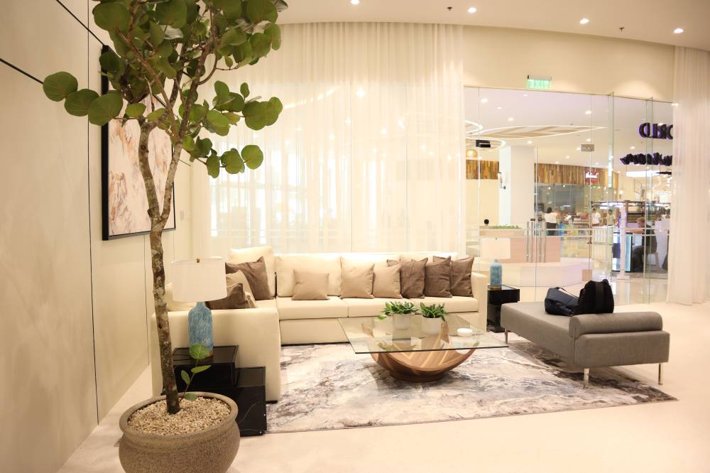 The showroom’s interior is designed based on a modern beachfront living concept, evident through the surfaces and finishes inspired by the sun, sand, stone, and the sea.
