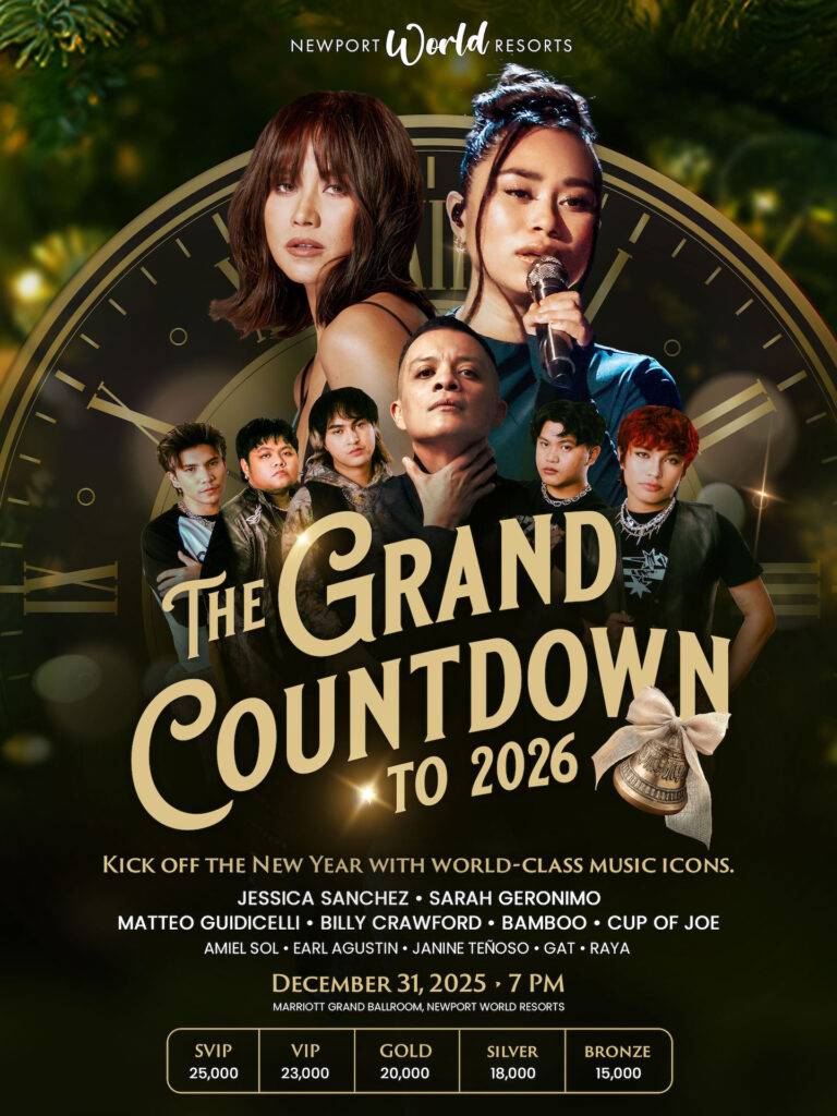 Newport World Resorts will be hosting The Grand Countdown to 2026 at the Manila Marriott Grand Ballroom, featuring performances from Jessica Sanchez, Sarah Geronimo, Bamboo, Matteo Guidicelli, Cup of Joe, Amiel Sol, Earl Agustin, and more.