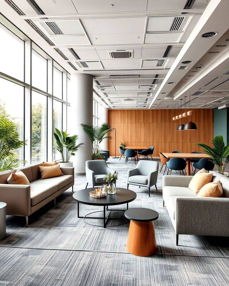 The workplace immediately feels warmer with a floor lamp and accent chairs. Plants in generous pots line one side of an open office, marking the edge of a quieter focus zone.