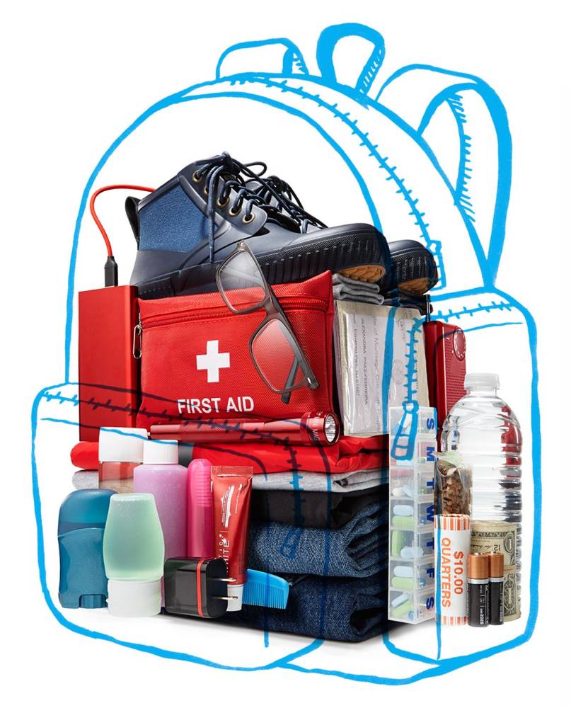 Include essentials like drinking water and ready-to-eat food; flashlight, extra batteries, and a power bank; first aid kit and maintenance medicines; copies of important documents in a waterproof pouch; extra cash; as well as face masks, hygiene supplies, and basic tools.
