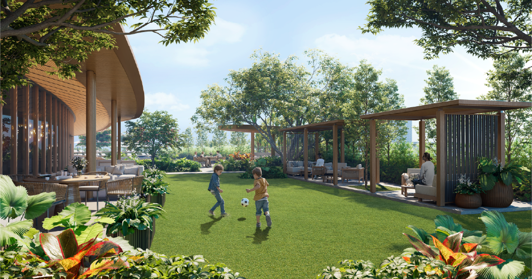 Developer information describes an expansive podium level with approximately 3,800 sqm of amenities, including a tropical swimming pool, landscaped gardens, fitness and yoga rooms, co-working spaces, and a ballroom-sized venue for social events. Residents have access to indoor and outdoor play spaces for children, private entertainment rooms, and a library-style workspace that supports focused tasks without leaving the property.