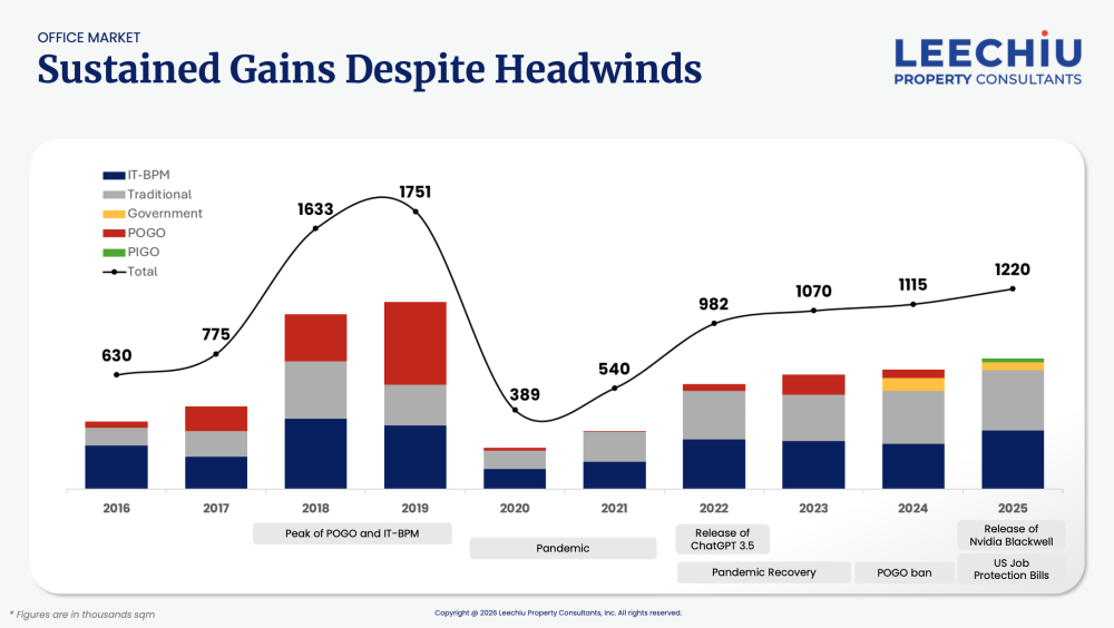 Office take-up reached 1.22 million sqm in 2025, up from 1.115 million sqm the prior year, marking sustained gains despite headwinds from the ban of Philippine offshore gaming operators (Pogos), US job protection bills, and the rapid evolution of AI.